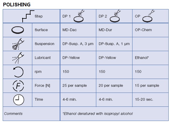 ●? 清洗用添加異丙醇的酒精在MDChem拋光布短暫輕拋,再漂洗和干燥,效果很好。如果使用自動加料磨拋系統,可用大劑量的無水潤滑劑,拋光數秒鐘,可以使隨后清洗方便。